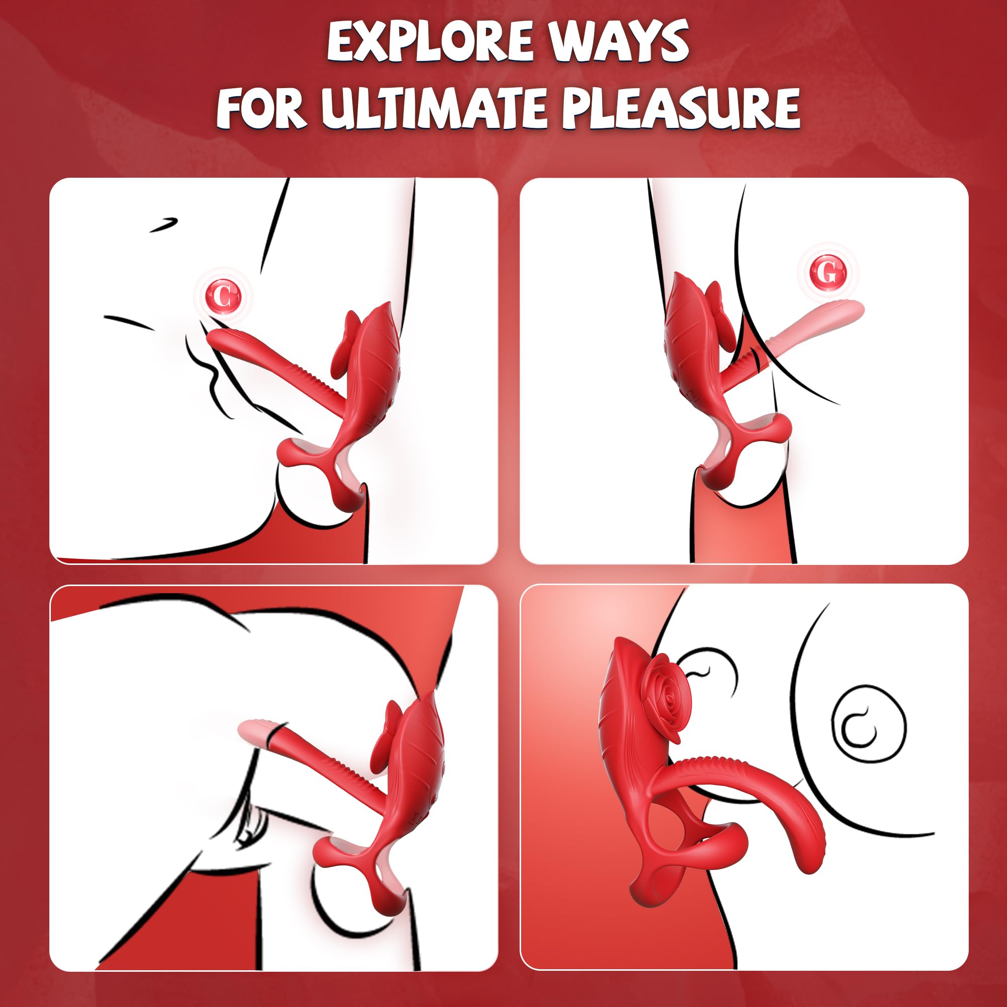Rose Vibrating Cock Ring: This vibrating penis ring features a triangular ring design, providing firm erection support and comfortably encircling the base of the penis. The soft, thickened sleeve increases penis size, while the rose-shaped clitoral vibrator delivers precise vibratory stimulation to the woman's most sensitive areas with every thrust.